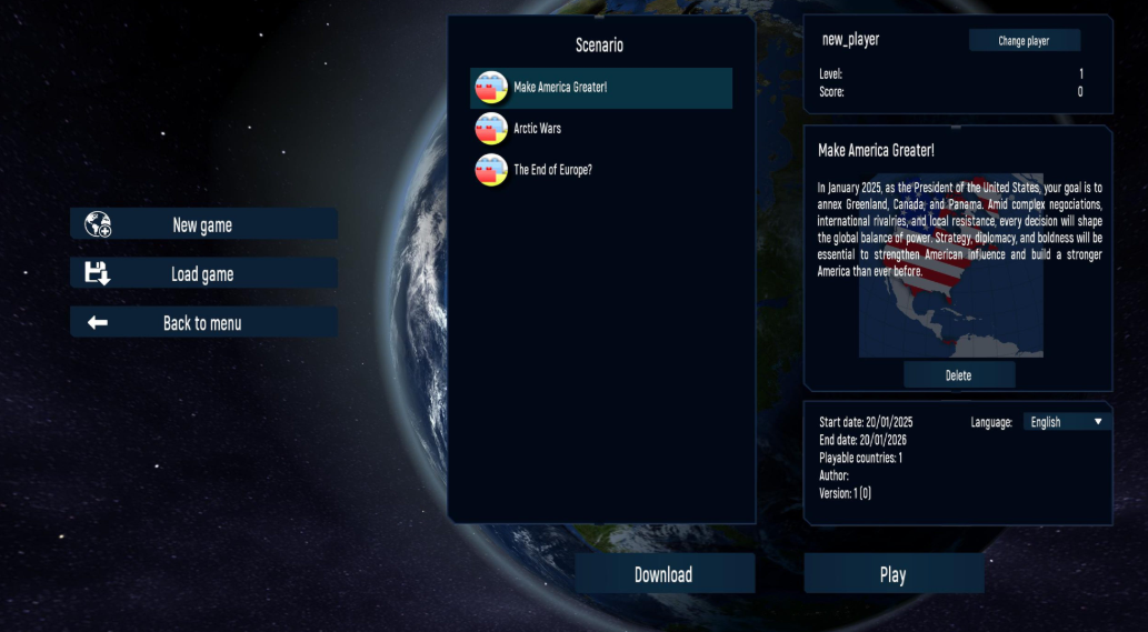 In January 2025, as the President of the United States, your goal is to annex Greenland, Canada, and Panama. Amid complex negotiations, international rivalries, and local resistance, every decision will shape the global balance of power. Strategy, diplomacy, and boldness will be essential to strengthen American influence and build a stronger America than ever before.