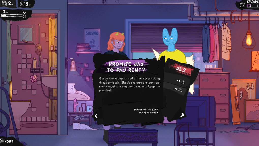 Manage Your Choices: Every choice affects Gordy's wellbeing, the band's power, her social points, or costs money.
