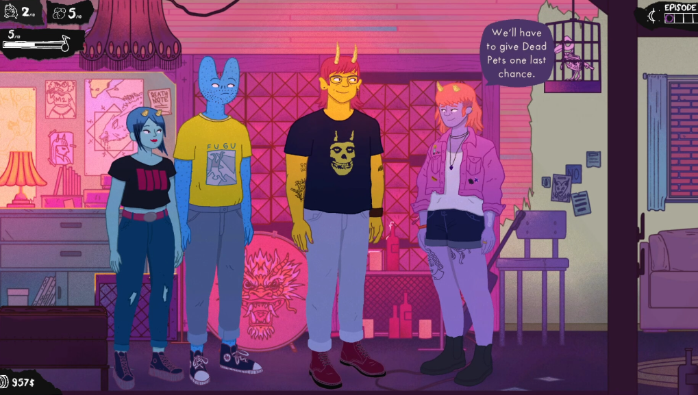 Dead Pets is a feminist, management-lite, minigame-heavy, slice-of-life, narrative game; about music, friendship, and maturing. Playing as Gordy, you’ll go to band practice, manage Gordy’s finances, her wellbeing, and try to find enough time and money to cover... well, everything.